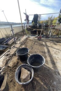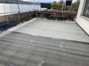 Die Terrasse unseres Bootshauses wird saniert. Nachdem die alten Platten abgetragen und der Bitumenbelag darunter entfernt wurde, war sichtbar, dass sich sehr viel Feuchtigkeit auf der gesamten Terrasse gebildet hat. Diese ist nun abgetrocknet und mit einer neuen 2-lagigen Bitumenabdeckung versehen.