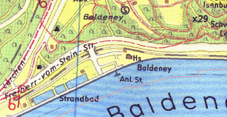 Die Bahnstrecke hinter unserem Haus wurde 1872 von der „Bergisch-Märkischen“ Bahngesellschaft“ eröffnet. Sie führte von Düsseldorf über Kettwig, Werden und Heisingen bis zum Bahnknotenpunkt Kupferdreh (die Verbindung von Werden über Stadtwald zum heutigen Hauptbahnhof kam erst ein paar Jahre später dazu). Diese Ruhrtalstrecke diente der Kohlenabfuhr der noch zahlreichen flußnahen Zechen, während der Personenverkehr bescheiden blieb. Ältere Mitglieder können sich noch an heulende Akku-Triebwagen erinnern, mit denen zum Beispiel Kinder von Heisingen knapp am Bootshaus vorbei zur Schule in Werden rumpelten. Der Fahrplan war im Jahr 1950 erstaunlich dicht: an Werktagen gut 20 Fahrten in jeder Richtung, deutlich mehr als vor dem Krieg. Außerdem dürften zu der Zeit Kohlen der Zeche Carl Funke über Werden gefahren sein, weil 1945 die Kupferdreher Ruhrbrücke gesprengt worden war. Es war also richtig viel Betrieb auf den Gleisen neben dem Verein. Aber 1951 liefen die Kohlenzüge wieder über die Kupferdreher Brücke, und der Personen-Fahrplan wurde bald drastisch ausgedünnt. Um 1960 knatterten statt der Akkuwagen nur noch wenige Schienenbusse am Clubheim vorbei, bis 1965 die Strecke Werden – Heisingen ganz stillgelegt wurde. Die Gleise sind schon so lange abgebaut, dass die Erinnerung daran und an den schwierigen Zugang zum Clubgelände verblasst. Die Bahntrasse war breiter als der heutige Radweg; einen Teil konnte die EKSG später von der Stadt Essen pachten. Dort stehen heute unsere Dickschiffe; man kann die alte Grenze noch am unterschiedlichen Bodenbelag erahnen.